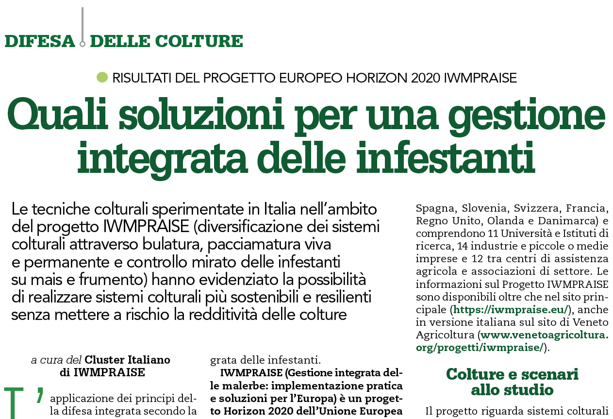 E’ stato pubblicato sul n. 38/2021 della rivista “L’Informatore Agrario” un articolo di 7 pagine a cura del Cluster italiano che illustra i risultati intermedi del progetto europeo Horizon 2020 “IWMPRAISE”. Nell’articolo vengono presentate le prove sperimentali realizzate in Veneto, Emilia-Romagna e Toscana di gestione integrata delle infestanti attraverso l’applicazione di varie tecniche colturali: prove di bulatura, devitalizzazione della coltura di copertura, selezione e gestione della pacciamatura viva per sistemi ortivi, gestione della vegetazione nei vigneti, controllo mirato delle infestanti in mais e frumento, gestione delle malerbe nella fase di transizione da agricoltura convenzionale a conservativa e tecniche di distruzione dei semi delle infestanti.