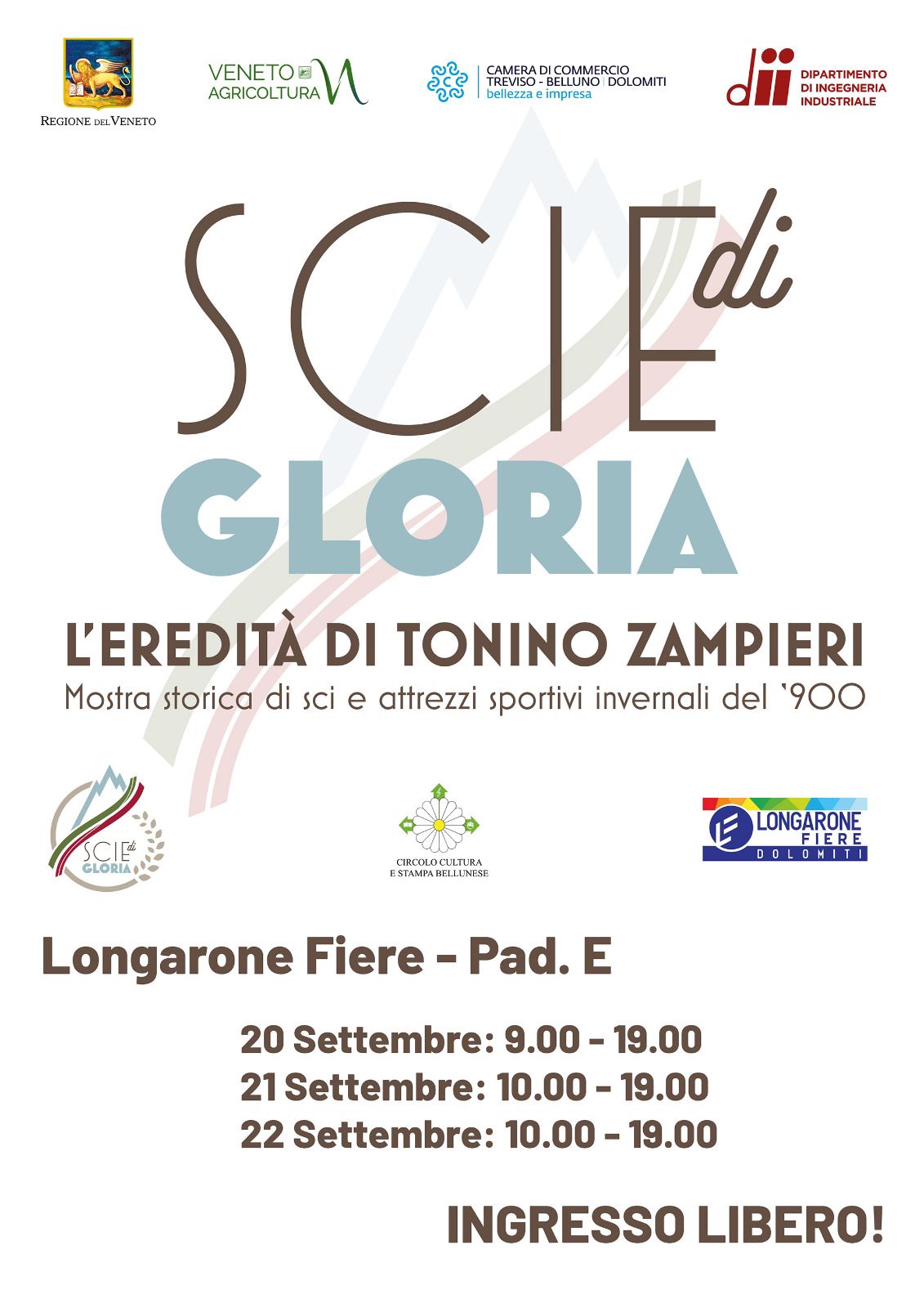 All’interno del Padiglione di Longarone Fiere, è aperta l’esposizione storica di sci e attrezzatura tecnica “Scie di gloria: l’eredità di Tonino Zampieri”, con la testimonianza speciale di Chiara Zampieri, figlia dell’ideatore della collezione.