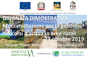 GIORNATA DIMOSTRATIVA Meccanizzazione per la gestione dei corsi d’acqua in aree rurali 23 ottobre 2019 Azienda dimostrativa “Diana” Bonisiolo di Mogliano veneto (TV) IL VIDEO DELLA GIORNATA DISPONIBILE QUI https://www.youtube.com/watch?v=6ogprLFX0xs La partecipazione alla sola Giornata dimostrativa è ad accesso libero (*). Al fine di organizzarla al meglio si invita a registrarsi su https://meccanizzazione-rive.eventbrite.it PER RAGGIUNGERE LA SEDE DELL’EVENTO = L’area dimostrativa è situata in via Grigoletto e Pasqualato (Bonisiolo di Mogliano v.). Ai piedi del cavalcavia sul Passante di Mestre…