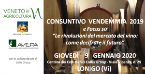 Veneto Agricoltura – Regione del Veneto – AVEPA, con la collaborazione di Collis, organizzano CONSUNTIVO VENDEMMIA 2019 e Focus su “Le rivoluzioni del mercato del vino: come decifrare il futuro” GIOVEDÌ 9 GENNAIO 2020 c/o Cantina dei Colli Berici Collis Group - Viale Vicenza, n. 29 LONIGO (Vi) DISPONIBILI LE SLIDE DEI RELATORI (CLICCA IN CORRISPONDENZA DEL TITOLO) ISCRIZIONE - Per una migliore organizzazione dell’evento è richiesta la preadesione da effettuarsi su eventbrite: https://trittico3-2019.eventbrite.it PROGRAMMA (SCARICA PROGRAMMA) Ore 9.30 -…