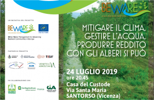 MITIGARE IL CLIMA, GESTIRE l’ACQUA, PRODURRE REDDITO: CON GLI ALBERI SI PUO’ 24 LUGLIO 2019 - ore 20.45 Casa del Custode, Via Santa Maria, Santorso (Vicenza) Una iniziativa promossa da Veneto Agricoltura in collaborazione con Coldiretti Vicenza, Confagricoltura Vicenza, Confederazione Italiana Agricoltori Vicenza nell’ambito del Progetto LIFE BEWARE - BEtter Water-management for Advancing Resilient communities in Europe Partner di progetto: Comune di Santorso, Comune di Marano Vicentino, TESAF, Università di Padova, Consorzio di Bonifica Alta Pianura Veneta, ALDA, Veneto Agricoltura…