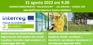 ZAKLJUČNI DOGODEK PROJEKTA BEE-DIVERSITY Izboljšanje biotske raznolikosti z inovativnim upravljanjem ekosistemov in spremljanjem dejavnosti čebel Miglioramento della biodiversità tramite la gestione innovativa degli ecosistemi e il monitoraggio delle api Azienda dimostrativa "ValleVecchia" - Sala dell'Osservatorio e Centro Visitatori - loc.Brussa - Caorle (VE) Iscrizione obbligatoria da effettuarsi su / Obvezen vpis na https://beediversity.eventbrite.it SCARICA LE SLIDE CLICCANDO SUL TITOLO DELLE RELAZIONI. GUARDA IL VIDEO INTEGRALE DELL'EVENTO IN ITALIANO - IN SLOVENO (YOUTUBE DI VENETO AGRICOLTURA) GUARDA IL VIDEO DI SINTESI…