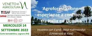 CORTE BENEDETTINA - LEGNARO (PD) Incontro con il prof. Vasyl Yukhnovskyi, Università di Kiev IL SEMINARIO SI TIENE IN LINGUA INGLESE SARA’ POSSIBILE SEGUIRLO ANCHE SU ZOOM, iscrivendosi a questo LINK https://bit.ly/3AWpzJL DISPONIBILI LE SLIDE DEI RELATORI (CLICCA SUL TITOLO DELLA RELAZIONE) PRESENTAZIONE L'agroforestazione è la tecnica che associa alberi, colture agrarie ed allevamenti animali, con diverse combinazioni, su una stessa superficie. In tutto il mondo vi è un crescente interesse per l'agroforestazione visti i suoi benefici in termini di produzione primaria, conservazione…