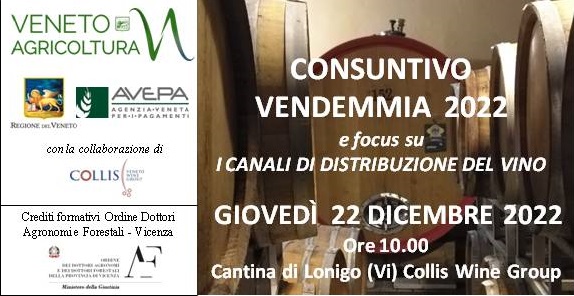 Nel terzo evento del Trittico, in programma giovedì 22 dicembre 2022 a Lonigo (Vi), presso la Cantina di Collis Wine Group, saranno presentati i dati consuntivi dell’ultima vendemmia nel Veneto e si affronteranno alcune tematiche inerenti i mercati del vino.