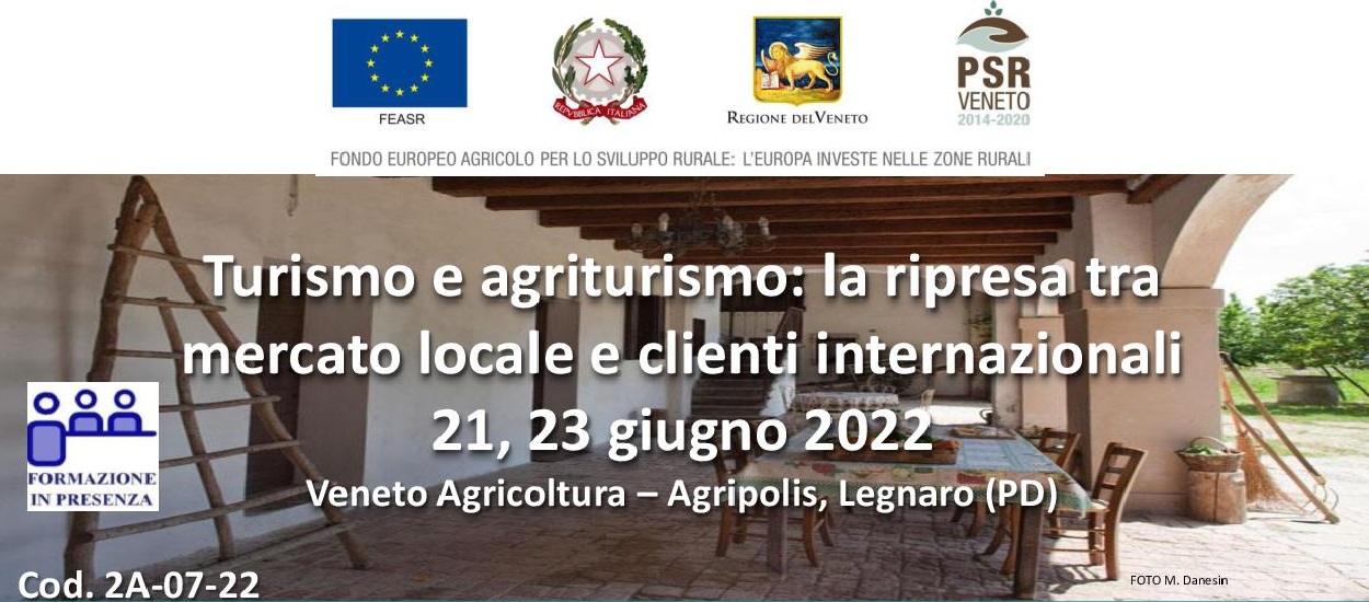 PRESENTAZIONE La presente iniziativa formativa rientra nel Programma di formazione dei consulenti che operano o intendono operare nell’ambito della Mis. 2 PSR «Servizi di consulenza, di sostituzione e di assistenza alla gestione delle aziende agricole». In particolare, l’argomento sviluppato attraverso l’iniziativa formativa fa riferimento agli Ambiti di consulenza n. 3, 7, 11 e nello specifico ai Percorsi di consulenza 2A.11.2 – Consulenza finalizzata all’avvio dell’attività di agriturismo ed enoturismo e 2A.11.7 – Consulenza su strategie di marketing per l’impresa agrituristica o esercente l’attività di enoturismo. Il consulente può completare il suo curriculum formativo frequentando le altre iniziative formative individuate nel programma di formazione disponibile qui: CALENDARIO 2022 DELLE ATTIVITA’ FORMATIVE PER CONSULENTI (2.3.1 PSR) – Veneto Agricoltura/