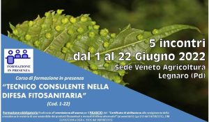 CORSO IN PRESENZA (COD.3-22) OBIETTIVI Il corso di aggiornamento, della durata complessiva di 16 ore, è finalizzato al RINNOVO del “Certificato di Abilitazione allo svolgimento dell’attività di Consulente in materia di uso sostenibile dei prodotti fitosanitari e metodi di difesa alternativi” (Patentino Consulenti). DESTINATARI Il corso di aggiornamento è RISERVATO ai tecnici abilitati per la consulenza in materia fitosanitaria, come previsto dalla DGRV 1101 del 18/08/2015 e che necessitano di rinnovare la validità del “patentino” per consulenti. NB – E’…