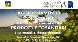 CORSO ON LINE - FORMAZIONE A DISTANZA (COD.2-22) OBIETTIVI Il corso di aggiornamento, della durata complessiva di 16 ore distribuite in quattro mezze giornate, è finalizzato al RINNOVO del “Certificato di Abilitazione allo svolgimento dell’attività di Consulente in materia di uso sostenibile dei prodotti fitosanitari e metodi di difesa alternativi” (Patentino Consulenti). DESTINATARI Il corso di aggiornamento è RISERVATO ai tecnici abilitati per la consulenza in materia fitosanitaria, come previsto dalla DGRV 1101 del 18/08/2015 e che necessitano di rinnovare…