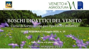 CORSO PARTE ON LINE E PARTE IN PRESENZA - APRILE-MAGGIO 2022 OBIETTIVI Il corso, della durata di 64 ore distribuite in 14 giornate (da 4/8 ore ciascuna), è finalizzato alla formazione della figura di Operatore dei Boschi didattici del Veneto (art. 5 L.R. n. 14/2020). Finalità del corso è assicurare le competenze indispensabili per la conoscenza del sistema forestale regionale e per un’efficace comunicazione, accompagnamento e gestione di gruppi, didattica ambientale con elementi di primo soccorso. DESTINATARI Secondo quanto prescritto…