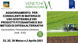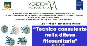 FORMAZIONE OBBLIGATORIA FINALIZZATA ALL’AMMISSIONE ALL’ESAME PER IL RILASCIO DEL “CERTIFICATO DI ABILITAZIONE ALLO SVOLGIMENTO DELLA CONSULENZA IN MATERIA DI USO SOSTENIBILE DEI PRODOTTI FITOSANITARI E METODI DI DIFESA ALTERNATIVI” (ai sensi del D.Lgs 150 del 14/08/2012, DM 22/01/2014 e DGR n. 1101 del 18/08/2015) ISCRIZIONI CHIUSE PER SOPRAGGIUNTO NUMERO MASSIMO DI ISCRITTI CORSO ON LINE - FORMAZIONE A DISTANZA (COD.4-21) 27 e 29 APRILE - 3, 6, 11, 13, 18, 19 e 25 MAGGIO 2021 PRESENTAZIONE Il “Consulente in materia…