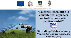 “La consulenza oltre la consulenza: approcci metodi, strumenti e professionisti” Giovedì 29 Febbraio 2024 Veneto Agricoltura Agripolis, Legnaro (PD) PRESENTAZIONE - La figura del consulente si sta progressivamente evolvendo e va ben oltre la semplice implementazione tecnica del servizio rivolto alle aziende. Infatti, il suo ruolo si caratterizza sempre più per una visione olistica e per la conoscenza delle diverse modalità utili alla diffusione della conoscenza: formazione, convegnistica, editoria, multimedialità, web, gestione dei dati, ecc. e che saranno oggetto del…