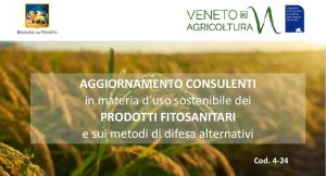 CORSO DI AGGIORNAMENTO IN PRESENZA (COD.4-24) OBIETTIVI Il corso di  aggiornamento, della durata complessiva di 16 ore, è finalizzato al RINNOVO del “Certificato di Abilitazione allo svolgimento dell’attività di Consulente in materia di uso sostenibile dei prodotti fitosanitari e metodi di difesa alternativi” (Patentino Consulenti). DESTINATARI Il corso di aggiornamento è RISERVATO ai tecnici abilitati per la  consulenza in materia fitosanitaria, come previsto dalla DGRV 1101 del 18/08/2015 e che necessitano di rinnovare la validità del “patentino”  per consulenti. NB…
