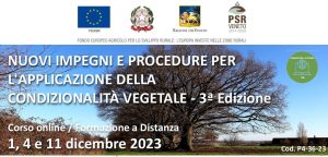 SEMINARIO IN MODALITÀ ON LINE - FORMAZIONE A DISTANZA - COD.P4-11-23 PER SCARICARE LE PRESENTAZIONI CLICCA SUI NOMI DEI DOCENTI NEL PROGRAMMA SOTTOSTANTE PRESENTAZIONE L’iniziativa formativa rientra nel Programma di formazione dei consulenti che operano o intendono operare nell’ambito della Mis. 2 PSR «Servizi di consulenza, di sostituzione e di assistenza alla gestione delle aziende agricole». In particolare, l’argomento sviluppato attraverso l’iniziativa formativa fa riferimento agli Ambiti di consulenza n. 1 “Rispetto degli obblighi aziendali derivanti dai criteri di gestione…