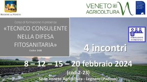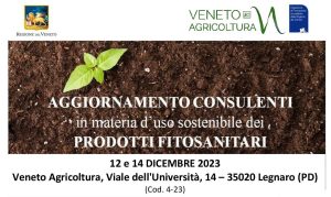 OBIETTIVO DEL CORSO Il corso di aggiornamento, della durata complessiva di 16 ore, è finalizzato al RINNOVO del “Certificato di Abilitazione allo svolgimento dell’attività di Consulente in materia di uso sostenibile dei prodotti fitosanitari e metodi di difesa alternativi” (Patentino Consulenti). DESTINATARI Il corso di aggiornamento è RISERVATO ai tecnici abilitati per la consulenza in materia fitosanitaria, come previsto dalla DGRV 1101 del 18/08/2015 e che necessitano di rinnovare la validità del “patentino” per consulenti. NB – E’ possibile verificare…
